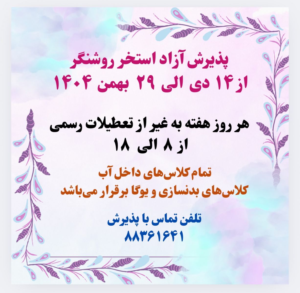 از تاریخ ۱۴ دیماه؛ مجموعه استخر روشنگر همه روزه به غیر از تعطیلات رسمی، از ساعت ۸ الی ۱۸ پذیرای بانوان محترم میباشد.