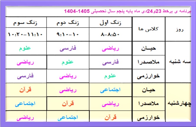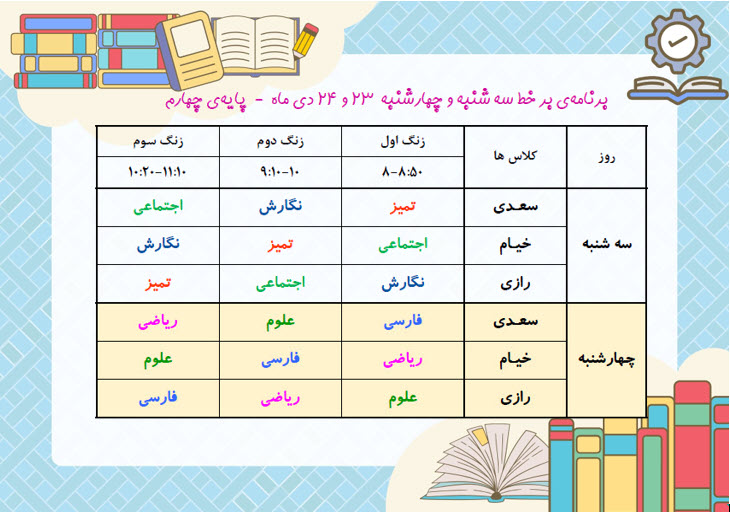 - مدت زمان هر کلاس 50 دقیقه است و زمان استراحت بین هر کلاس 20 دقیقه میباشد.