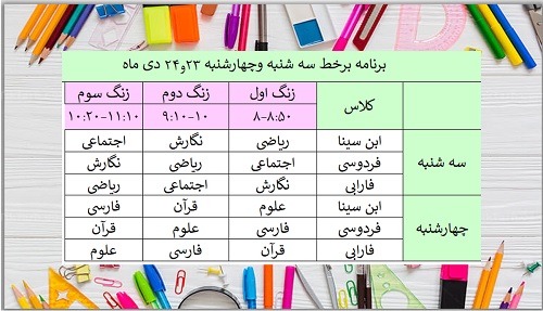 دانش آموزان عزیز سه شنبه 23 دی ماه از ساعت 8 تا 13 میتوانید جهت دریافت بسته آموزشی به مدرسه تشریف بیاورید